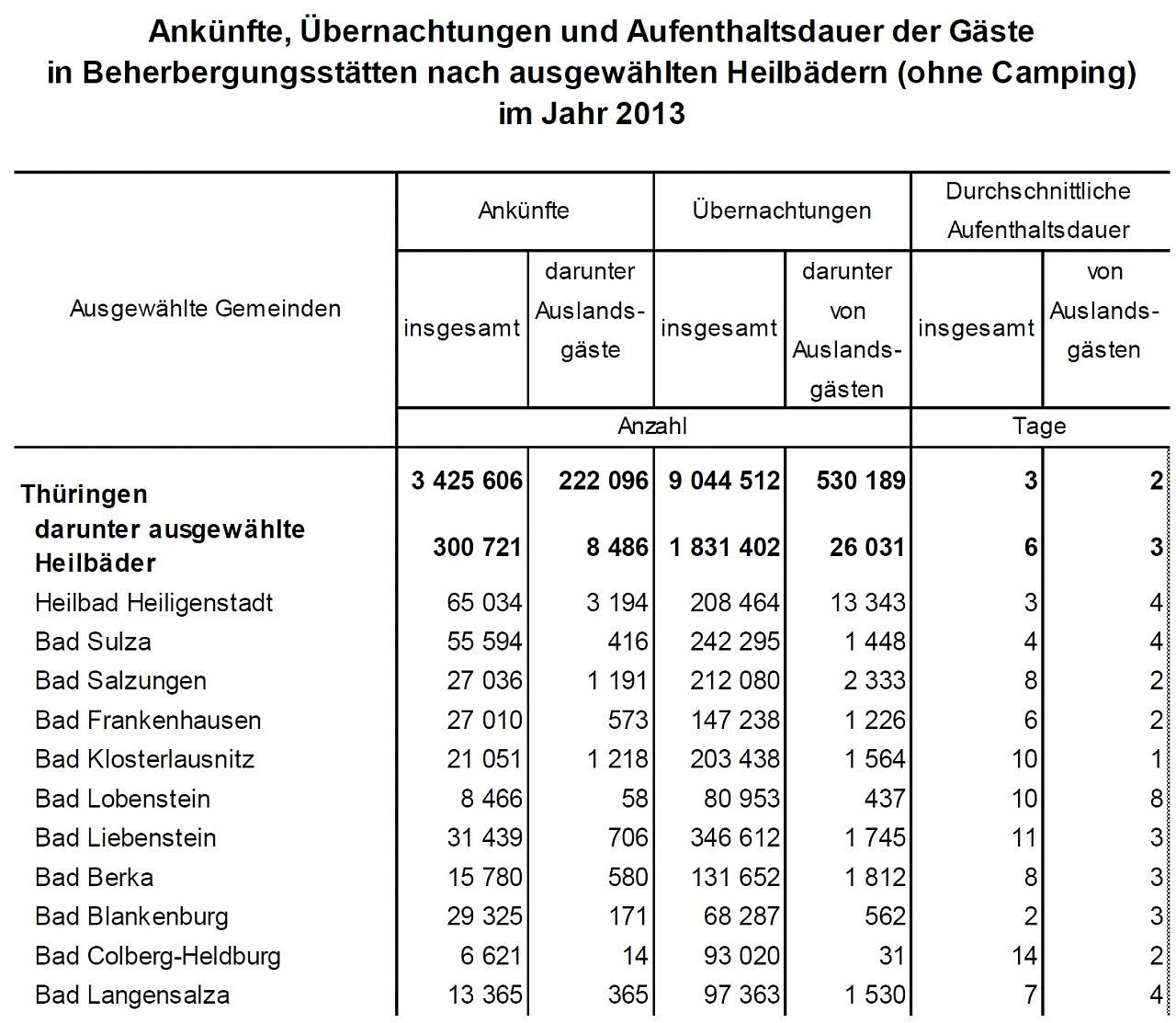 In den elf ausgewählten Heilbädern Bad Heiligenstadt, Bad Sulza, Bad Salzungen, Bad Frankenhausen, Bad Klosterlausnitz, Bad Lobenstein, Bad Liebenstein, Bad Berka, Bad Blankenburg, Bad Colberg-Heldburg und Bad Langensalza wurden im vergangenen Jahr durch 301.000 Gästeankünfte 1,8 Millionen Übernachtungen gebucht. Die ausgewählten Heilbäder erreichten damit rund ein Fünftel der Thüringer Übernachtungszahlen.