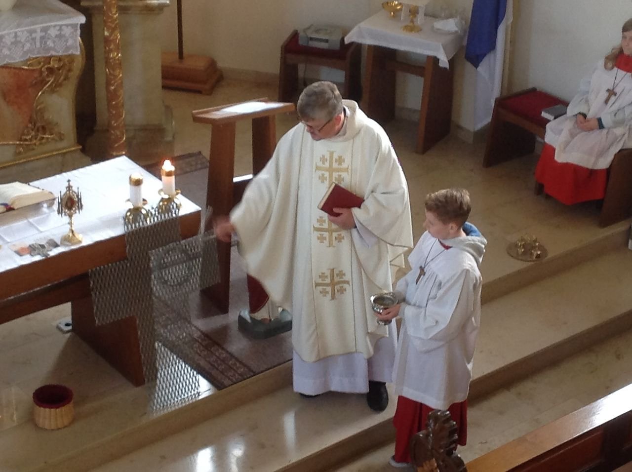 Pfarrer Günter Christoph Haase nach dem Patronatsamt in der Flinsberger St. Martinskirche am vergangenen Sonntag beim Segnen eines Kreuzes aus Original Grenzzaun von Hohengandern....