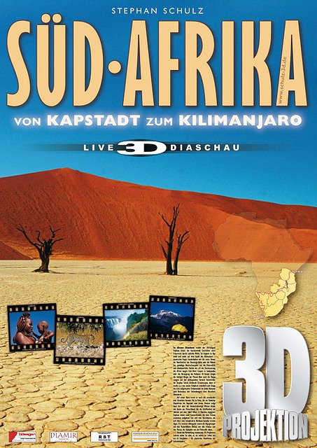 In dieser Diashow erzählt der 3D-Fotograf Stephan Schulz die faszinierende Geschichte einer Traumreise durchs südliche Afrika. Sie beginnt in Kapstadt, führt durch Traumlandschaften wie Fish River Canyon, Namibwüste oder Victoriafälle und endet auf dem Gipfel des Kilimanjaro. Aber auch die Tierwelt hinterließen bei Stephan Schulz bleibende Erinnerungen, denn er wurde u.a. von einem Flußpferd attackiert.Auf seiner Reise lernte er auch die verschiedensten Menschen kennen, z.B. einen Winzer, der die Sektflaschen am liebsten mit dem Säbel öffnet oder den Buschleuten, die sich über eine komplizierte Klicklaut-Sprache verständigen.