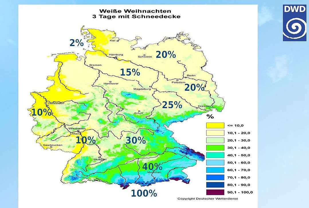 Da tagegenaue Wettervorhersagen auf wissenschaftlicher Basis nur etwa eine Woche im Voraus möglich sind - mit einem groben Trend auch 10 Tage – können in diesem Jahr vom DWD bisher nur statistische Aussagen über die mittlere Wahrscheinlichkeit für Weiße Weihnachten abgegeben werden.