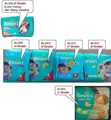 Fünfmal in den letzten acht Jahren wurde die Anzahl der Windeln pro Pampers-Packung reduziert, von ursprünglich 47 Stück, über 44, 40, 37, 34 auf aktuell 31 Stück.