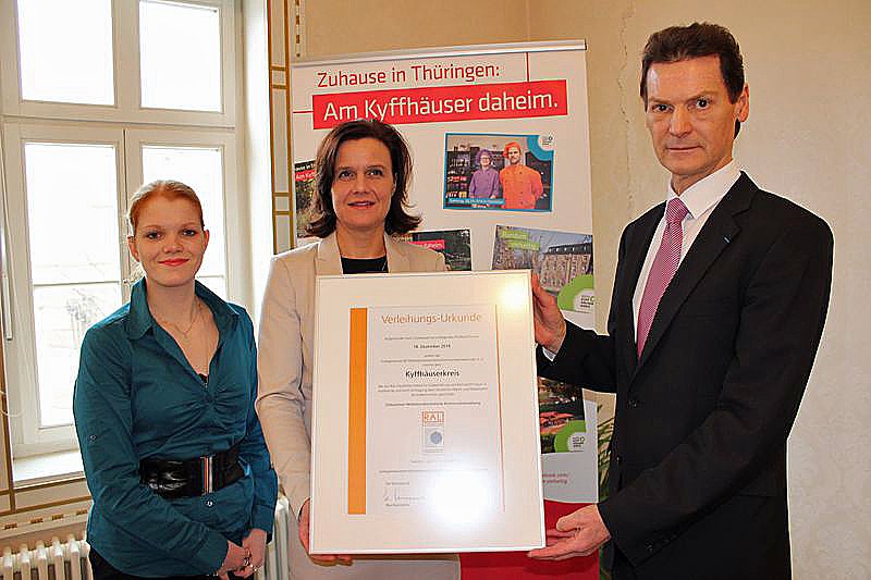 Übergeben wurde das Zertifikat durch Gerald Grusser, dem Hauptgeschäftsführer der IHK Erfurt an Landrätin Antje Hochwind (SPD) und eine führende Bearbeiterin aus dem Amt Wirtschaftsförderung und Kreisentwicklung, Francesca Martin (li.).