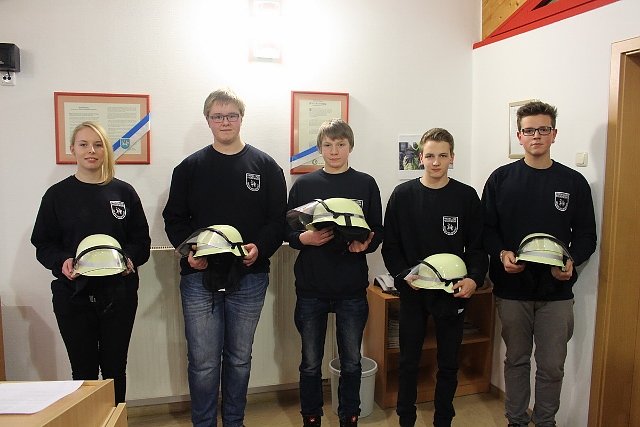 Fünf Mitglieder der Jugendfeuerwehr wurden an diesem Abend in die Einsatzabteilung übernommen. Janine Fiebelkorn, Jannis Gerling, Sebastian Hildebrand, Daniel Jahns und Marvin Reich beginnen in Kürze ihre Grundausbildung.