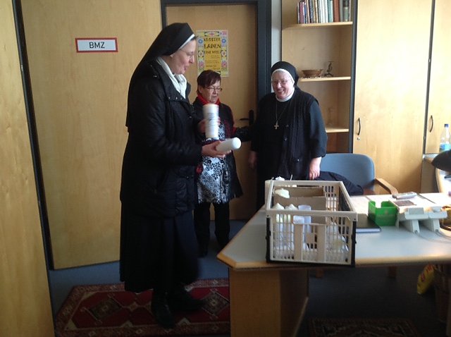 Schwester Maria Thoma (neue Generaloberin) und Schwester Beate nahmen, die von den Geisleder und Heuthener Erstkommunionkindern und Firmberwerbern gestalteten Kerzen in der Klosterpforte freudig in Empfang.