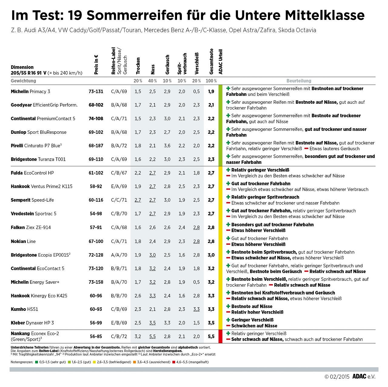 In der Reifendimension für Kleinwagen gab es sechsmal das Urteil gut, achtmal befriedigend und je einmal ausreichend (Kumho KH27 Ecowing ES01) und mangelhaft (Matador MP16). Continental ContiPremiumContact 5 glänzt mit sehr guten Handlings-Eigenschaften, der Goodyear Efficient Grip Performance mit den kürzesten Bremswegen. Das breite Mittelfeld zeigt leichte bis eindeutige Schwächen auf nasser Fahrbahn. Insgesamt jedoch gilt: Vor allem die mit gut bewerteten Reifen unterscheiden sich nur geringfügig voneinander.