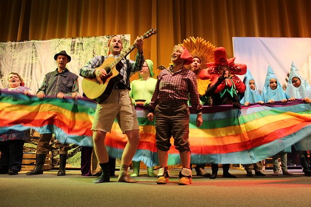 Während Kasper und Seppel ganz cool agierten, waren manche Mitspieler doch sehr aufgeregt. Auf einer richtigen Bühne zu stehen und vor solch einem großen Publikum zu spielen, war für einige eine ganz neue Erfahrung. Kasper und Seppel, die einer alten Frau, die sich später als gute Fee entpuppte, halfen und dadurch einen Wunsch frei hatten, wünschten sich, dass jeder Tag so sonnig sein sollte, wie heute.