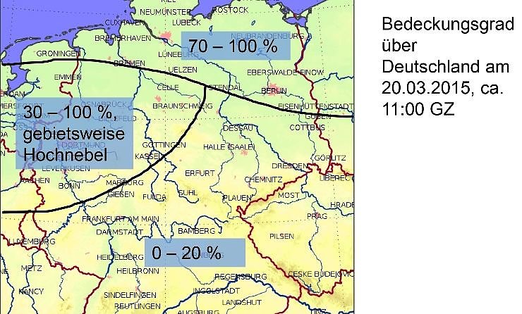 Konkret bedeutet dies für den Zeitraum der Sonnenfinsternis: In NRW, evtl. auch im nördlichen Rheinland-Pfalz meist trüb durch hochnebelartige Bewölkung. In Niedersachsen einige Auflockerungen, sonst ebenfalls trüb. Etwa nordöstlich der Elbe wolkig bis bedeckt. In Hessen, Thüringen, Bayern und Baden Württemberg meist sonnig, gebietsweise hohe Schleierwolken.