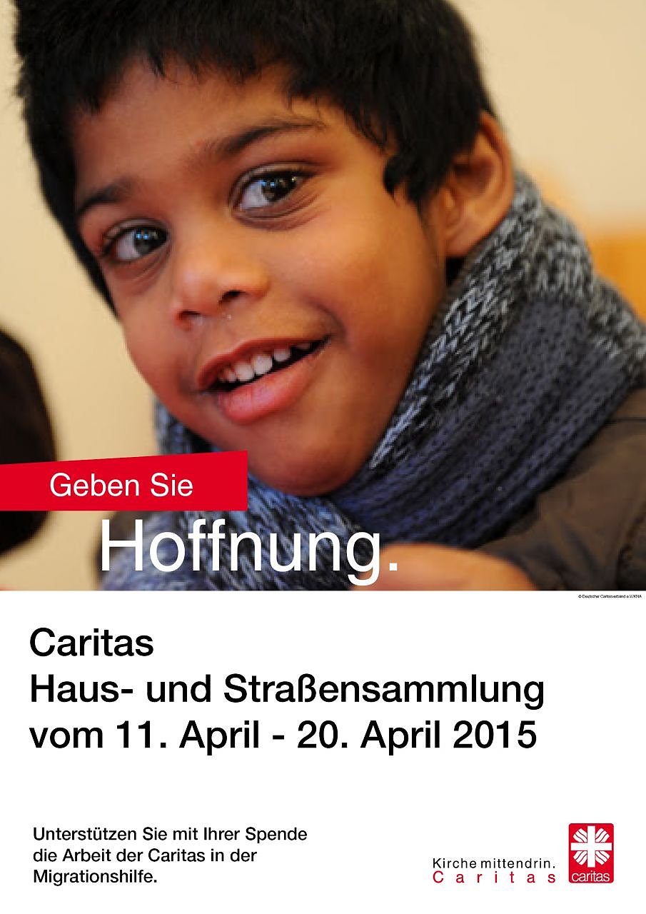 Die landesweite Caritas-Herbstsammlung vom 11. - 20. April 2015 steht unter dem Leitwort: Geben Sie Hoffnung!, denn die Kirche mit ihrer Caritas steht in einer besonderer Verantwortung für einen guten Umgang mit Flüchtlingen, Spätaussiedlern, Asylbewerbern, ausländischen Arbeitnehmern und ihren Familien. Migrationsdienste im Bistum Erfurt verstehen sich vielerorts als Anwalt betroffener Menschen und als Vermittler zwischen Fremden mit ihren Kulturen und der einheimischen Bevölkerung. Gut 500 Sammler werden bistumsweit auf Straßen und Plätzen unterwegs sein und um Spenden für die Caritas bitten. Gesammelt wird für die Arbeit der Caritasdienste – besonders der Migrationsdienste und für Menschen in Not. Das Ergebnis der Herbstsammlung 2014 betrug 33.325,78 Euro – 25 Prozent davon verblieben in den Pfarrgemeinden für die Caritashilfe vor Ort.