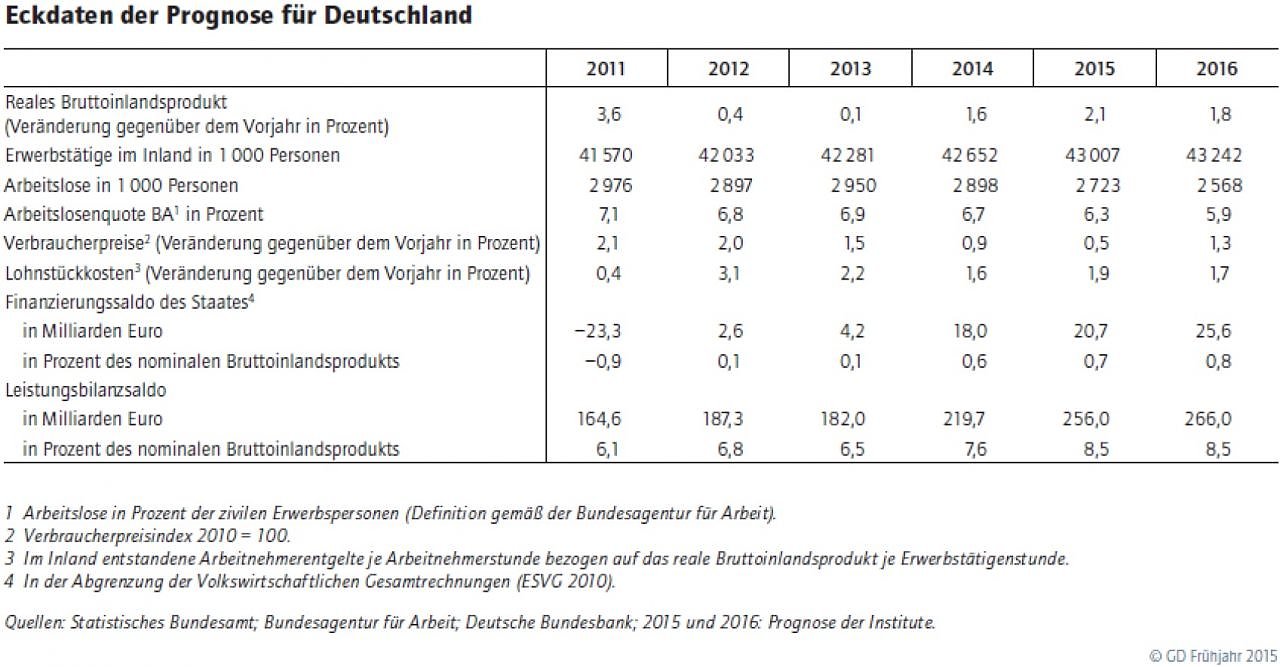 Die deutsche Wirtschaft befindet sich in einem kräftigen Aufschwung. Sie wird stimuliert von unerwarteten expansiven Impulsen, insbesondere dem Verfall des Ölpreises und der starken Abwertung des Euro. Das Bruttoinlandsprodukt wird in diesem Jahr voraussichtlich um 2,1 Prozent steigen...