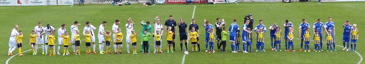 Die Mannschaften laufen ein. Wacker in Blau-Weiß.