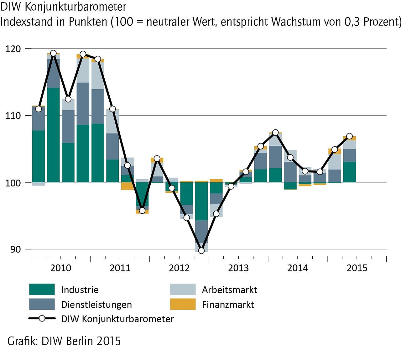 Die deutsche Wirtschaft dürfte auch im ersten Halbjahr kräftig wachsen. Darauf deutet das Konjunkturbarometer des Deutschen Instituts für Wirtschaftsforschung (DIW Berlin) hin, das für das erste und zweite Quartal jeweils einen Anstieg des Bruttoinlandsprodukts um 0,6 Prozent gegenüber dem Vorquartal anzeigt...