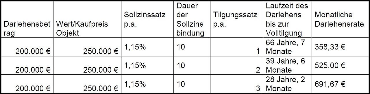 Anhand der folgenden Beispielrechnung wird deutlich, wie viel Potenzial in einer höheren Tilgung steckt, so kann die Laufzeit bei einer Erhöhung der Tilgung von ein auf drei Prozent mehr als halbiert werden.