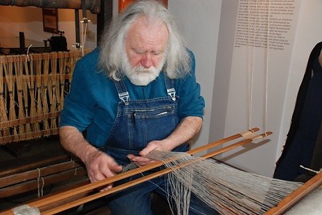 Eine Reise in die Vergangenheit unternimmt der Weber Gerhard Kalden am historischen Webstuhl und zeigt Alles rund ums Weben und Spinnen. Von der Verarbeitung der Flachsfasern, über die Garnvorbereitung bis hin zum Leinengewebe können seine Werke bestaunt werden. Dabei dürfen die großen und kleinen Besucher nicht nur miterleben, wie aus einer Pflanze eine fertiger Stoff wird, sondern auch selbst ausprobieren wie man spinnt, spult und webt.