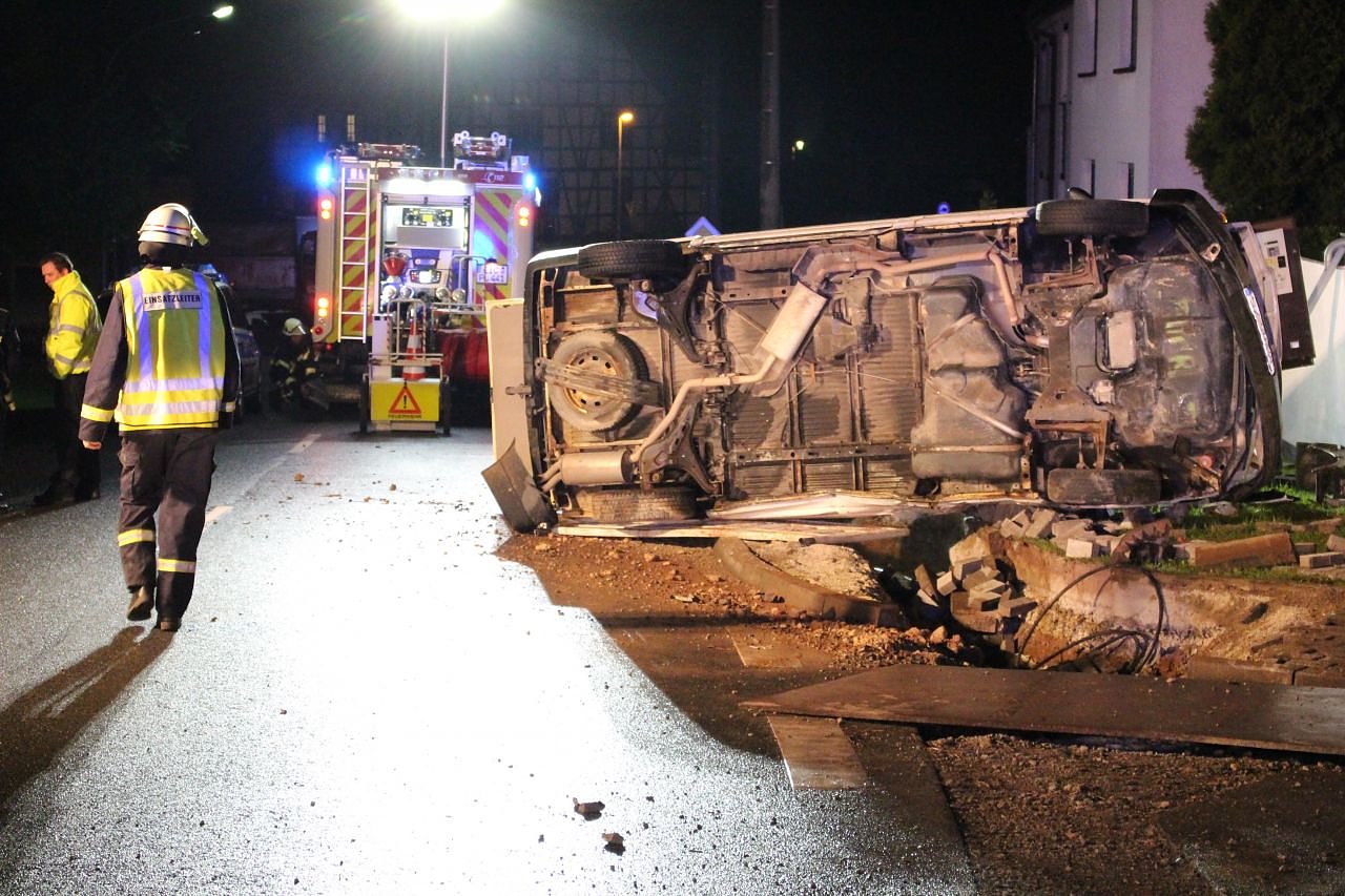 Die zuerst eingetroffenen Kräfte der örtlichen Feuerwehr fanden einen auf der Seite liegenden Kleinbus verlassen vor. Später griff die Polizei beide Fahrzeuginsassen auf, von denen einer durch den Rettungsdienst ins Krankenhaus gebracht wurde.