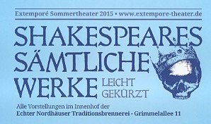 Der witzige Beitrag zur ewigen Shakespeare-Rezeption ist seit vielen Jahren weltweit ein Klassiker leichter und gekonnter Unterhaltung für überdurchschnittlich gute Schauspieler. Die kann der Nordhäuser EXTEMPORÉ Theaterverein seinem Publikum ab Anfang Juli wieder bieten. Mit Anika Kleinke kehrt eine aus dem erfolgreichen Ensemble des letzten Sommers (La Mandragola Der Liebestrank) zurück auf den Innenhof der Echter Nordhäuser Traditionsbrennerei in der Grimmelallee. Ihr zur Seite geben mit Oliver Seidel und Thomas Wiesenberg zwei großartige Komödianten erstmals ihre Visitenkarte in der Rolandstadt ab.