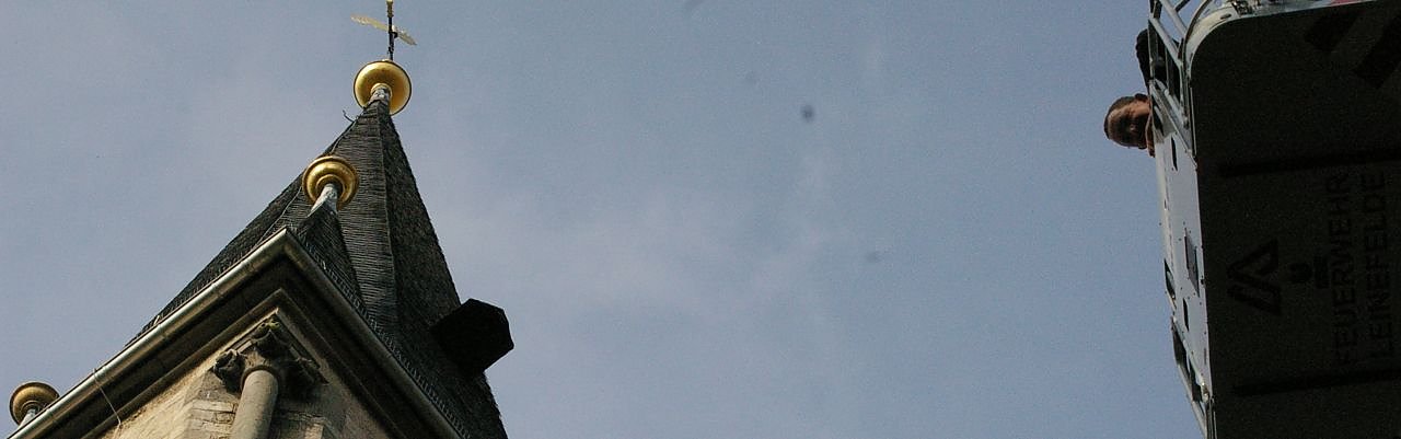 Als der Dechant aus der Kirche kam, wartete bereits die nächste Überraschung: die Feuerwehr war mit der großen Feuerwehrleiter gekommen und hob das Geburtstagskind über 30 Meter hoch, damit der Pfarrer auch mal von außen und ganz nah den sanierten Kirchturm anschauen und sich einen Überblick verschaffen konnte.