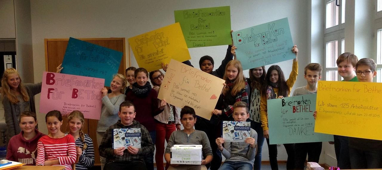 Unsere Sammelaktion läuft bis zum 23. Oktober 2015 in der Schule und in den umliegenden Gemeinden. Wir haben uns das ehrgeizige Ziel gesetzt, zwei Umzugskartons voll mit Briefmarken nach Bethel zu senden. Durch die Briefmarken helfen wir mit, 125 Arbeitsplätze zu erhalten. Diese werden von behinderten Menschen ausgefüllt, die sich sehr gut mit Briefmarken auskennen und die die geschickten Marken sortieren und weiter verkaufen. Denn es gibt weltweit viele Sammler. Der Verkaufserlös kommt direkt der Briefmarkenstelle in Bethel zugute.
