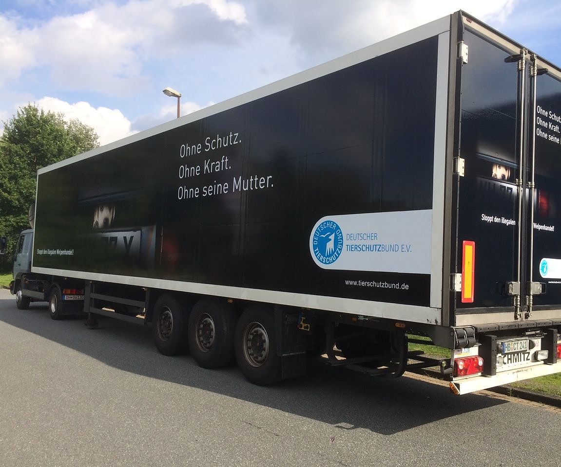 Auch auf der Autobahn bekommen die Tierschützer Unterstützung: Pünktlich zum Welttierschutztag startet ein LKW mit dem Welpen-Kampagnenmotiv und dem Aufruf „Stoppt den illegalen Welpenhandel!“ seine Fahrt über Deutschlands Straßen. Ein zweiter LKW zeigt zudem das aktuelle Zirkusmotiv des Deutschen Tierschutzbundes. Beide Fahrzeuge hatte das Bremer Transportunternehmen CCT-Logistik dem Verband kostenfrei für die Bedruckung zur Verfügung gestellt.