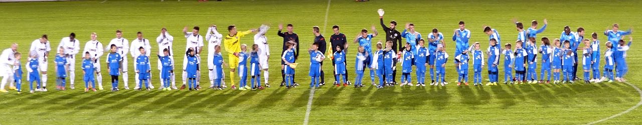 Die Mannschaften kommen auf das Spielfeld.