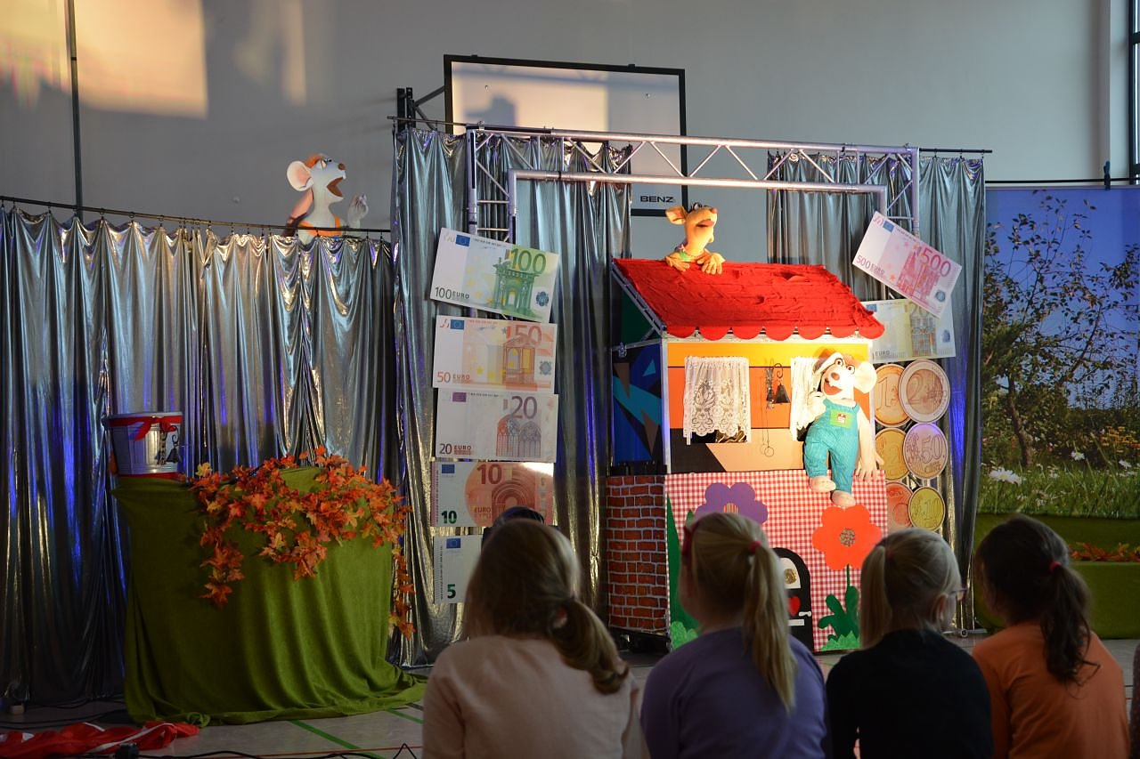 Eine Unterrichtsstunde lang hat das Theaterteam den jeweils ca. 60 Grundschülern der 1. – 4. Klassen das Thema Geld und Sparen vermittelt. Die lustigen Charaktere um Clown Hajo ließen die Kinder Situationen wiedererkennen, in denen es nicht nur um Geld, sondern auch um den Umgang mit fremdem Eigentum geht.