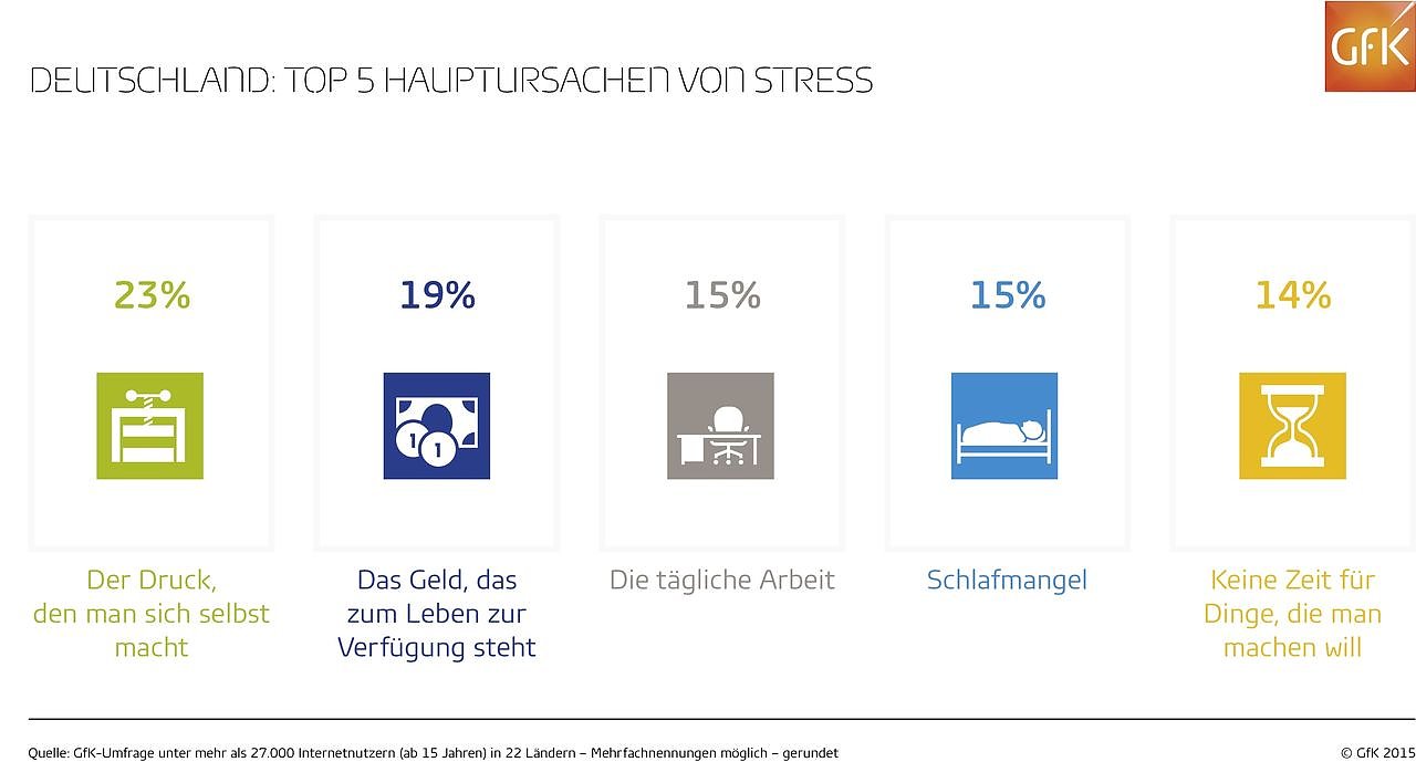 Der am häufigsten genannte Grund für Stress ist bei den deutschen Befragten der Druck, den sie sich selbst machen (23 Prozent). Rund 19 Prozent geben als wichtigen Stressfaktor das Geld an, das ihnen zur Verfügung steht. Auch wenig Schlaf und die tägliche Arbeitsbelastung werden von jeweils 15 Prozent der Verbraucher genannt. Dicht gefolgt von der Aussage, nicht genug Zeit für Dinge zu haben, die man gerne machen will.