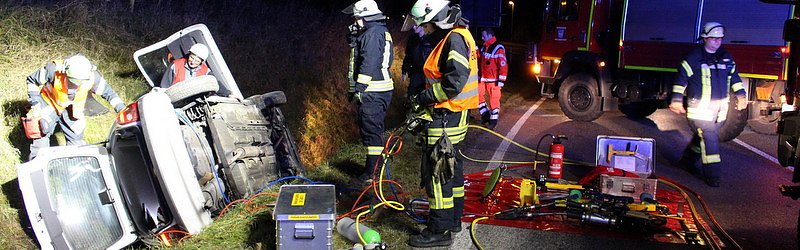 Vor Ort fand Einsatzleiter Heinz Anhalt eine Person im Pkw vor, die bereits durch den Rettungsdienst versorgt wurde. Die Hände des Betroffenen waren unter dem Unfallfahrzeug eingeklemmt. Um diese zu befreien, setzte die Feuerwehr Hochdruckhebekissen ein. Für die anschließende Rettung des Patienten mit Hilfe des Spineboards schufen die Einsatzkräfte mit dem hydraulischen Rettungsgeräten ausreichend Platz.
