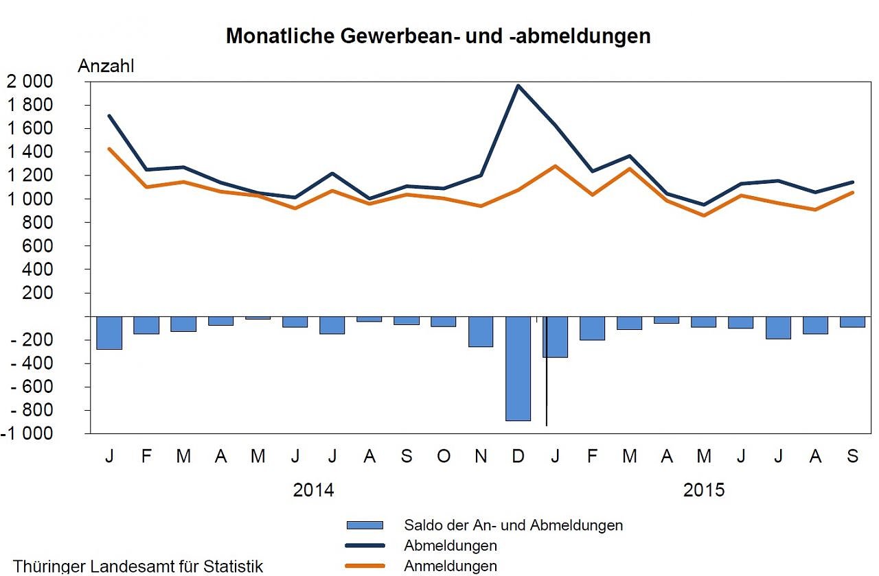 In Thüringen gab es von Januar bis September 2015 gegenüber dem entsprechenden Vorjahreszeitraum sowohl weniger Gewerbeanmeldungen als auch weniger Gewerbeabmeldungen...