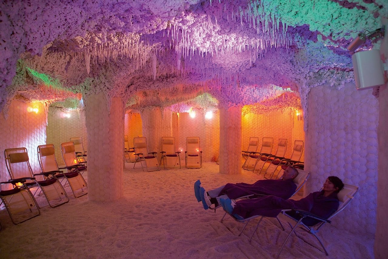 Die Totes-Meer-Salzgrotte hat innerhalb der Therme einen separaten Zugang. Hier inhalieren Erwachsene und Kinder bei einer Raumtemperatur von 22°C und einer