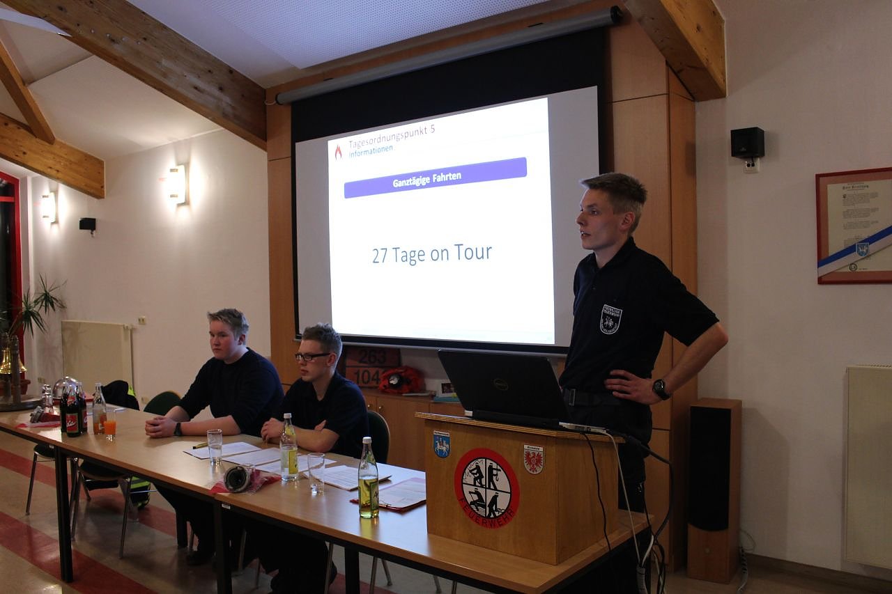 Zu Beginn berichtete Jugendsprecher Niklas Jahns über die Aktivitäten und Erlebnisse des vergangenen Jahres. Zum Ende seiner Rede bat er die drei Ausbilder Alexander-Raphael Beck, Markus Wand und Martina Griethe nach vorn. Mit einer kleinen Aufmerksamkeit bedankte er sich bei ihnen für ihre Arbeit seit nun schon 15 Jahren in der Jugendfeuerwehr.