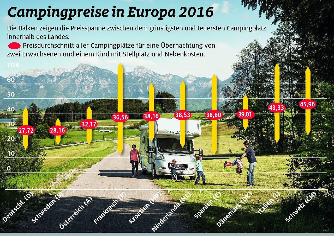 Zweitgünstigstes Campingland ist Schweden mit einem Durchschnittspreis von 28,16 Euro. Im Mittelfeld liegen Österreich (32,17), Frankreich (36,56), Kroatien (38,16) und die Niederlande mit 38,53 Euro. Teuerstes europäisches Campingland 2016 ist erneut die Schweiz (45,96 Euro). Am zweitteuersten campt man in Italien mit durchschnittlichen Übernachtungskosten von 43,33 Euro. Auf den Plätzen drei und vier folgen Dänemark (39,01) sowie Spanien (38,80).