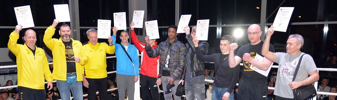 Die Mannschaften werden in den Ring gerufen, der Ringsprecher kündigt den Kampf "als Duell um die Deutsche Mannschaftsmeisterschaft" an.