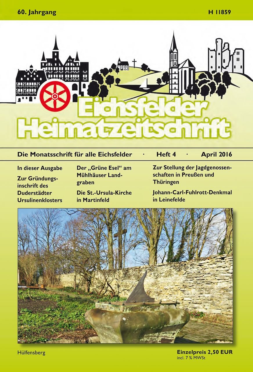 Im Eichsfeld unterwegs, in Martinfeld, war diesmal wieder Josef Keppler. Näher angesehen hat er dabei die dortige St.-Ursula-Kirche. Dr. Gerd Leuckefeld stellt den langjährigen Revierförster auf der Burg Scharfenstein, Carl Ignaz Goldmann (* 1841 in Großbartloff) vor. Peter Anhalt hat die Hochzeitstermine in Steinbach auf statistische Regelmäßigkeiten untersucht. Auf merkwürdige Aufzeichnungen des Pfarrers Christoph Eibes in Wiesenfeld im Jahre 1803 ist Bernd Homeier gestoßen und hat diese für das aktuelle Heft aufbereitet.