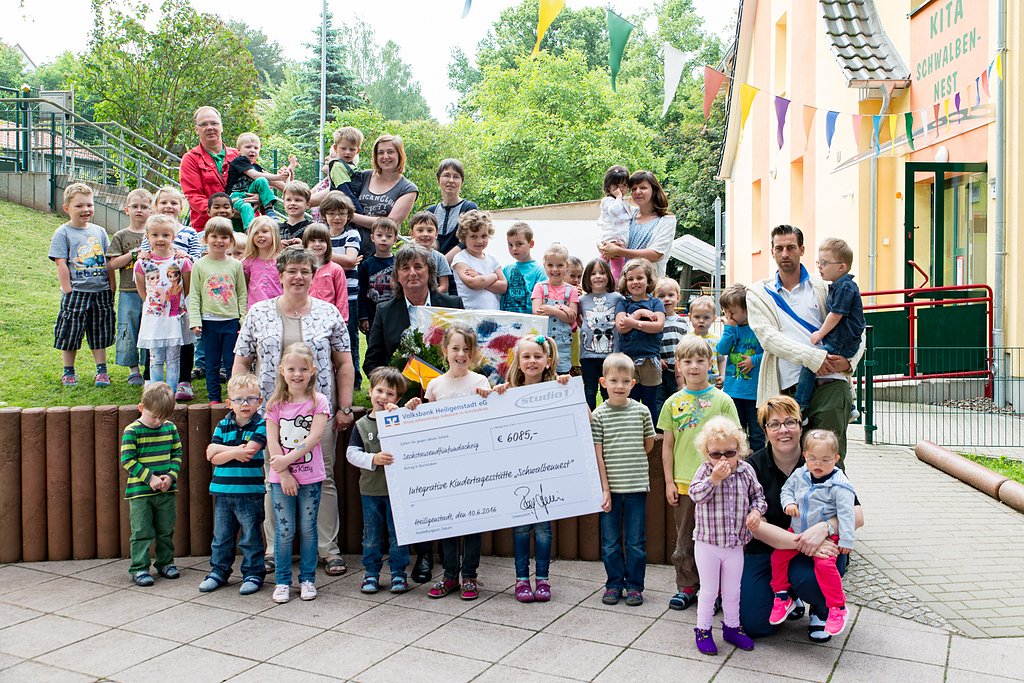 Die Integrative Kindertagesstätte Schwalbennest aus Heilbad Heiligenstadt kann sich über einen Geldbetrag in Höhe von genau 6.085 Euro freuen. Heute Vormittag hat Studio1® Geschäftsführer Ralf Halbhuber den Scheck an Sylvia Leonhardt, die Leiterin der Kita für behinderte und nicht behinderte Kinder, übergeben.....