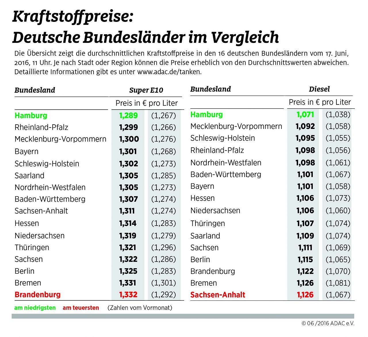 In Hamburg zahlen Autofahrer 1,289 Euro für einen Liter Super E10. Um 4,3 Cent teurer ist Benzin dagegen in Brandenburg, wo ein Liter im Landesmittel 1,332 Euro kostet. Für Diesel zahlt man in der Hansestadt zurzeit 1,071 Euro. Beim Tabellenletzten Sachsen-Anhalt liegt der Preis für den Selbstzünderkraftstoff bei 1,126 Euro. Die Preisdifferenz bei Diesel beträgt damit 5,5 Cent.