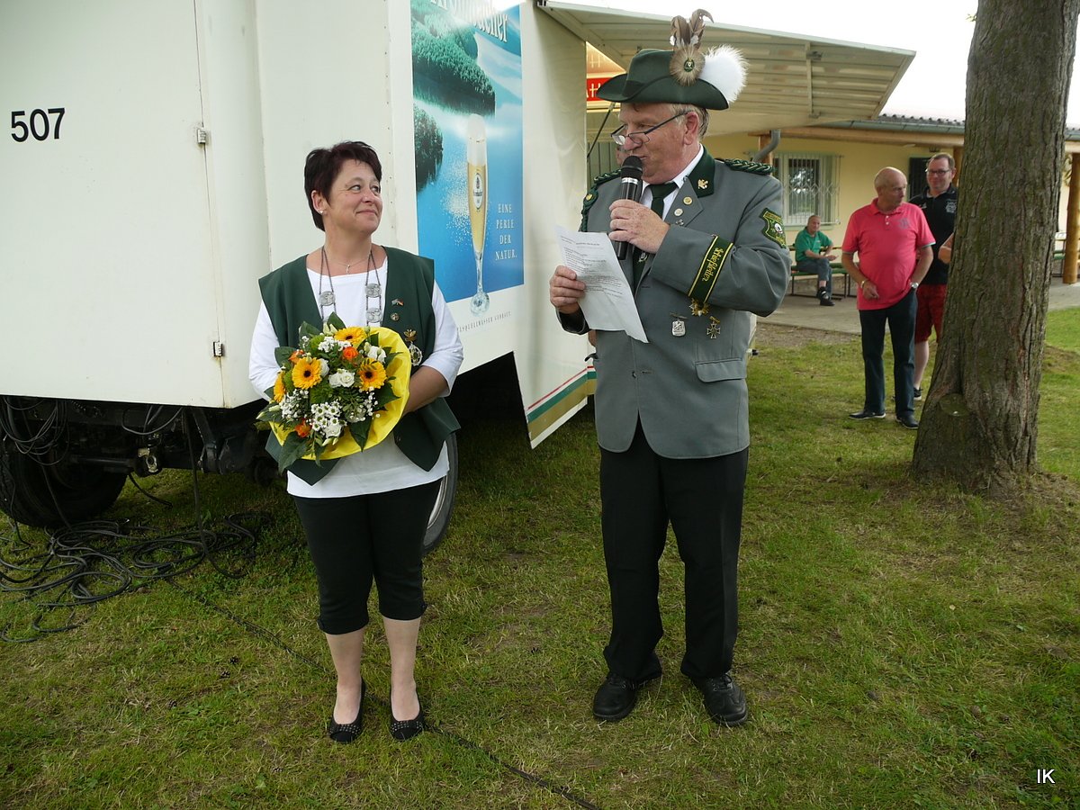 27 Stunden dauere noch die Amtszeit der bisherigen Schützenkönigin Elvira, sagte Uwe Seeland, es sei denn, sie verlängert. Mit einem Blumenstrauß dankte er für ihre Arbeit und ihr Engagement als Stellvertreterin im Schützenverein, die Ehrenformation schoss dreimal Salut.