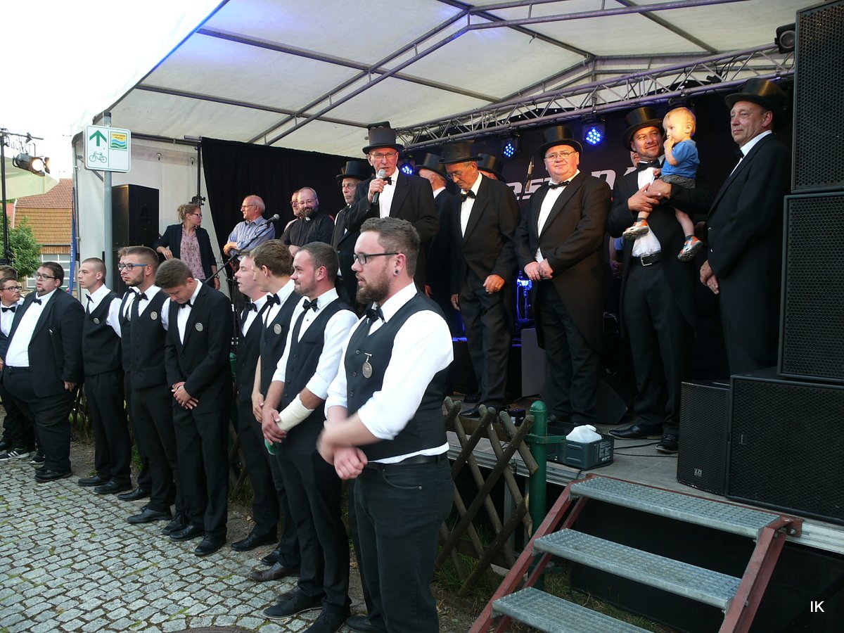 Reinhardt plauderte noch so allerlei, verriet auch das eine oder andere aus der Geschichte Leinefeldes, verwies auf die diesjährige Kirmesfeier und übergab dann irgendwann auch das Mikro an den jetzigen Bürgermeister, Marco Grosa. Mensch Gerd, dass ich das noch erleben darf, sagte dann Marco Grosa. Er habe die Rede aus dem Hintergrund (der Bühne) interessiert verfolgt. Eigentlich habe er gedacht, er sagt nur: Wie das mit der Ringaukirmes war, habt ihr 26 Jahre lang gehört, deshalb machen wir das viel kürzer: Gut Durst!" - Aber er sagte dann doch noch etwas, und zwar zu seinem ersten offiziellen Kirmessonntag in Leinefelde. Mit der Kutsche herumzufahren sei etwas ganz tolles. Drei Jahre habe er von Breitenbach her den Umzug mitgemacht. Aber der Sonntag sei für ihn schon eine Art Zerreißprobe gewesen.Er habe da einiges gelernt. So darf man nicht immer aussteigen, wenn die Kutsche anhält und nicht überall die Schnäpse mittrinken...... Für nächstes Jahr wird er sich was einfallen lassen, sagte er zum Abschluss dem johlenden Publikum. Und eins musste er klarstellen. Wer immer behauptet hat, wenn Grosa Bürgermeister wird, gibt es keine Ringaukirmes mehr. Das sei totaler Blödsinn, er sei ein Fan der Ringaukirmes schon immer gewesen, sagte Marko Grosa.