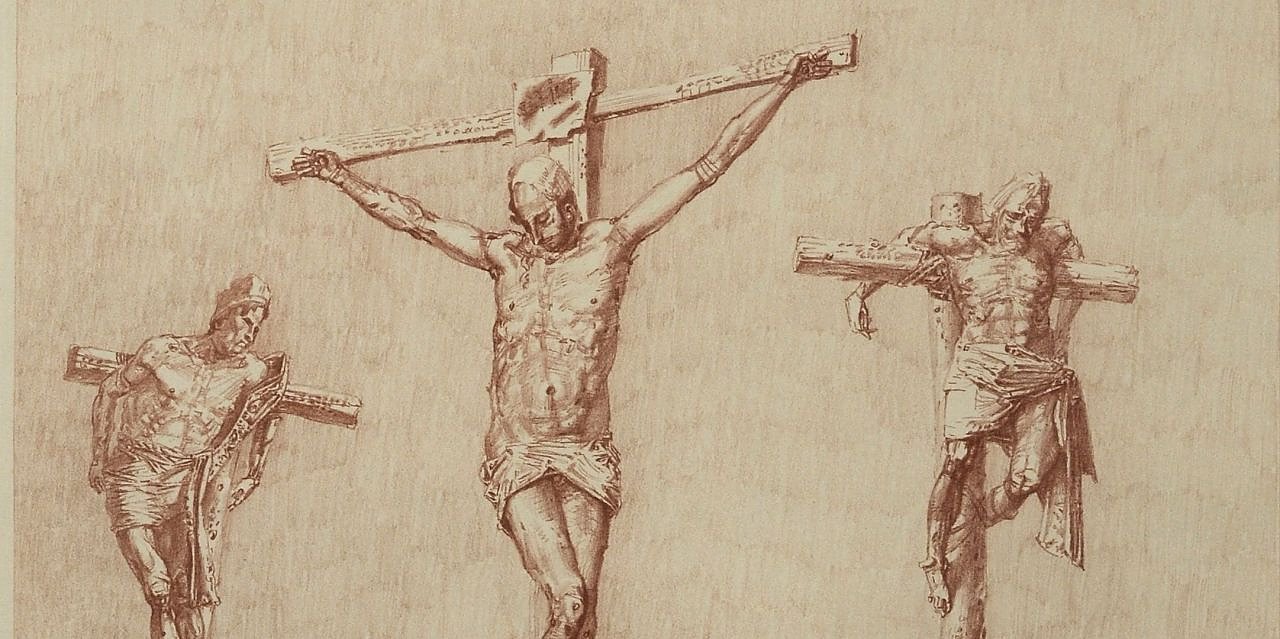 Zu den außergewöhnlichen Werken gehört auch die Kreidelitho „Kreuzigungsszene“ von Werner Tübke von 1984.
