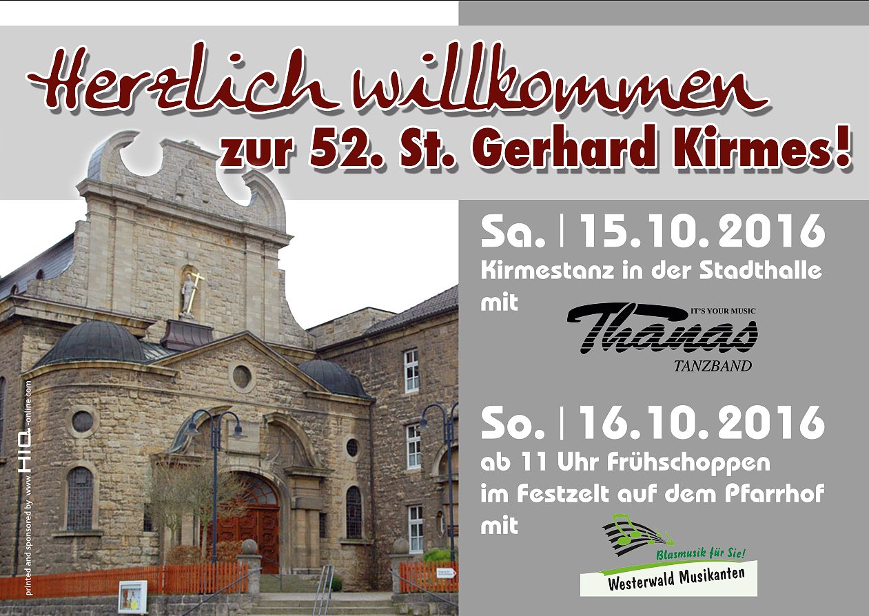 Den Auftakt in das Kirmeswochenendende stellt die Gerhardmesse am kommenden Samstag, 15. Oktober um 08:00 Uhr dar, bei der alle Mitglieder des Kirmesvorstands, die den Namen Gerhard tragen, als Ministranten dem Pfarrer zur Seite stehen....