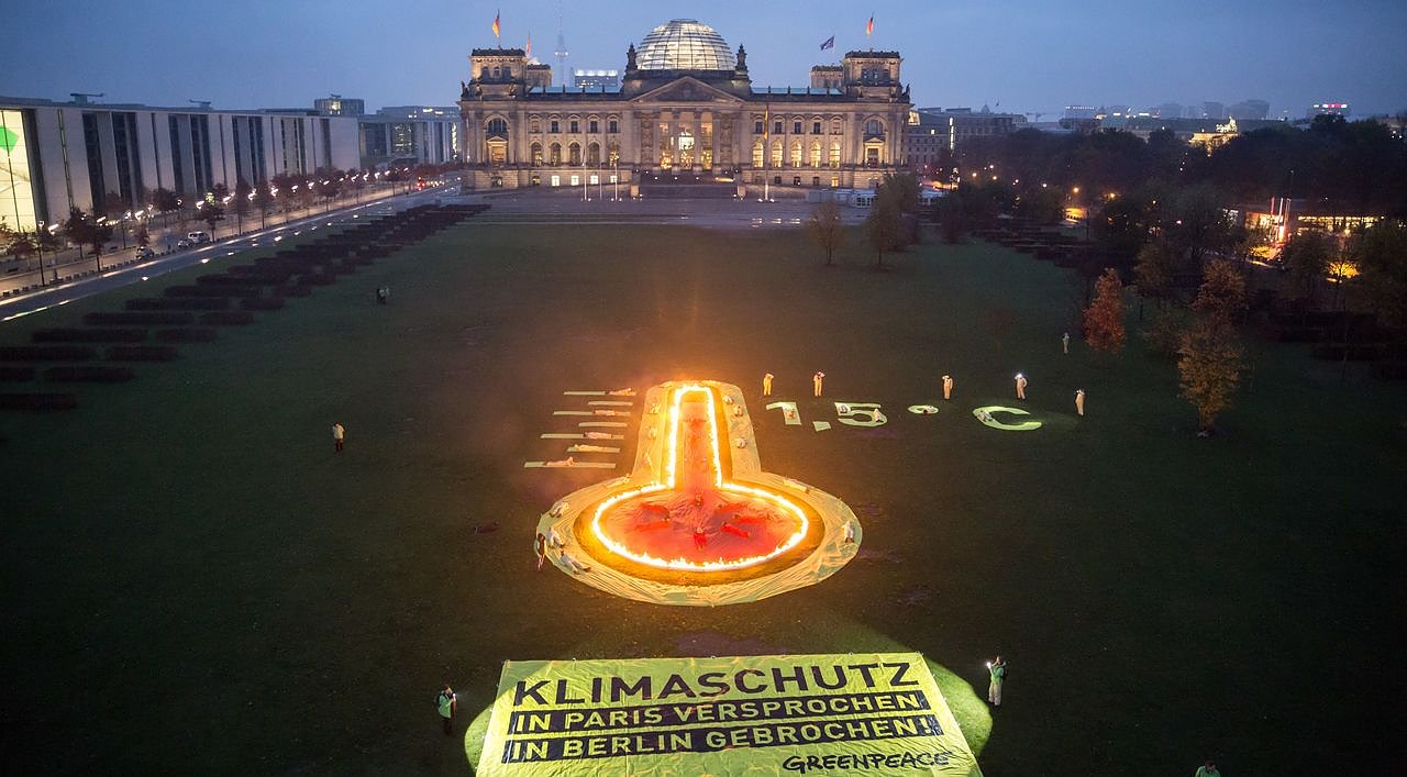 Auf einem Banner steht Klimaschutz: In Paris versprochen. In Berlin gebrochen. Deutschlands Klimaschutzbemühungen bleiben weit hinter dem auf der Weltklimakonferenz 2015 in Paris vereinbarten Ziel zurück, die Erderwärmung auf 1,5 Grad zu begrenzen.