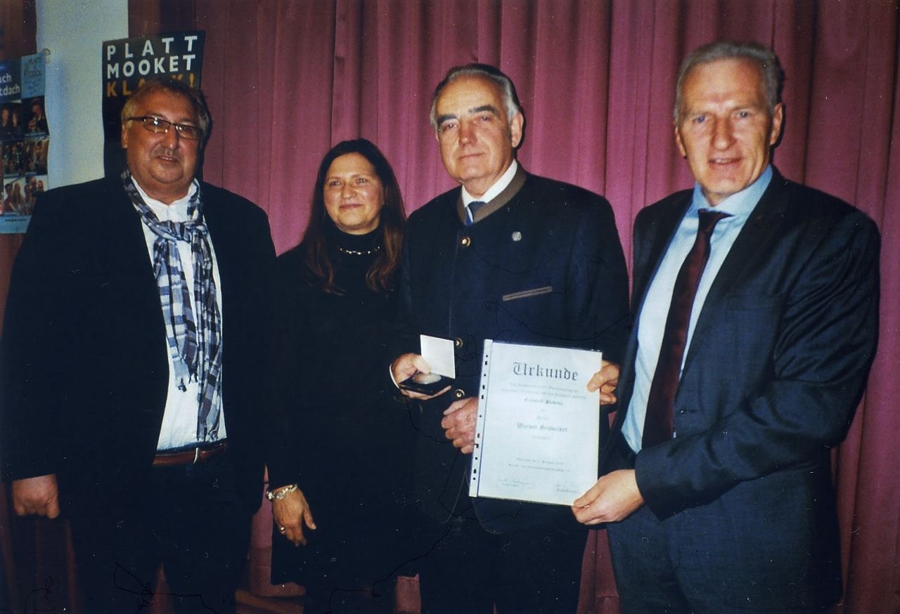 Der Vorsitzende des Heimat- und Verkehrsverbandes Eichsfeld, Gerold Wucherpfennig, überreichte in dessen Auftrag die Eichsfeldplakette mit Urkunde an Werner Grobecker für sein vielfältiges Engagement für die Belange des Eichsfeldes, namentlich für die Förderung und den Erhalt des hohen Kulturgutes plattdeutsche Sprache.