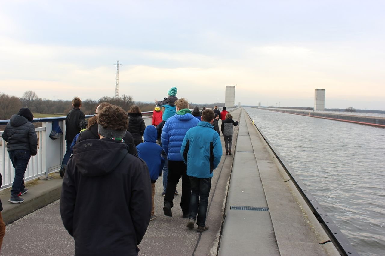 Nach einer Frühstückspause auf halber Strecke war das Wasserstraßenkreuz Elbe - Mittellandkanal erstes Ausflugsziel. Hierzu erläuterte ein Fremdenführer während einer zweistündigen Besichtigung Fakten und Hintergründe. Besonders beeindruckte die Teilnehmer die 918 Meter lange Trogbrücke, welche den Mittellandkanal über die Elbe führt. Es handelt sich dabei um die weltweit größte Kanalbrücke.