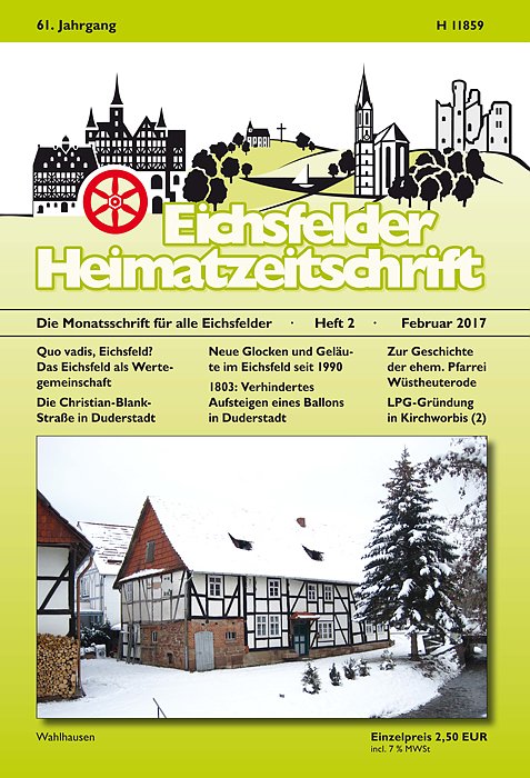 ...Das Eichsfeld als Wertegemeinschaft von Peter Anhalt, seines Zeichens Vorsitzender des Vereins für Eichsfeldische Heimatkunde. Im Weiteren stellt Elmar Brohl den Namensgeber der Christian-Blank-Straße in Duderstadt vor. Robert Riethmüller schreibt über neue Glocken und Geläute im Eichsfeld seit 1990. Darin erfährt der Leser, dass in den letzten 26 Jahren 150 neue Glocken ins Eichsfeld gekommen sind, teil als notwendiger Austausch oder als Vervollständigung bestehender Geläute. Über das verhinderte Aufsteigen eines großen Ballons im Jahre 1803 in Duderstadt berichtet Dr. Ulrich Hussong. Seinen Beitrag zur LPG-Gründung in Kirchworbis schließt Dr. Manfred Goedecke im vorliegenden Heft ab. In die 700-jährige Geschichte der ehemaligen Pfarrei St. Bonifatius Wüstheuterode haben sich Dr. Andreas Degenhardt und Mathias Degenhardt vertieft. Bernd Homeier hat einen Blick in die Kirchenbücher der evangelischen Kirchengemeinde Großtöpfer geworfen. Aktuelle Kurzberichte und Nachrichten stellen die Verbindung zur Gegenwart her und runden das Heft ab.