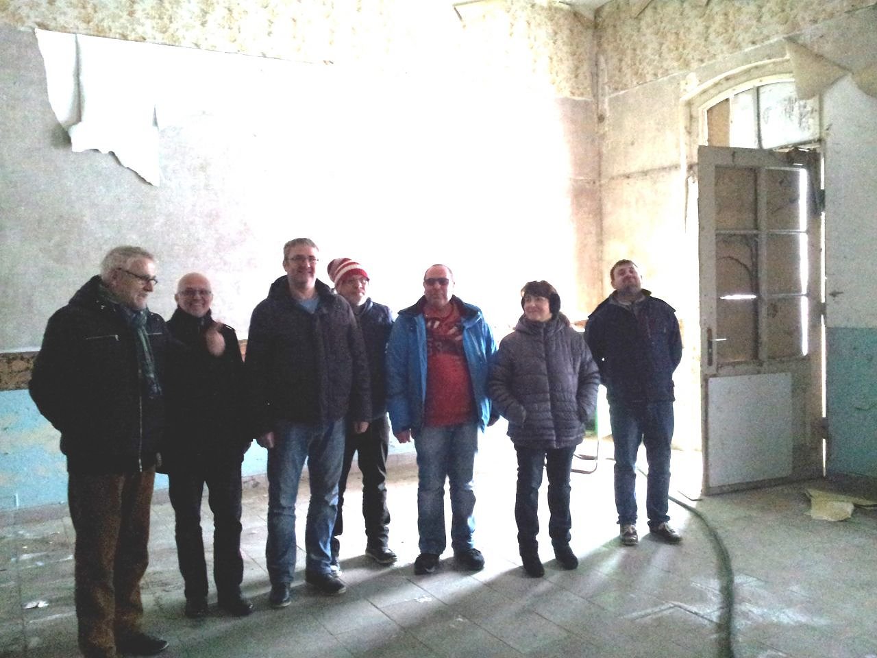 Hier steckt viel Potential in dem Gebäude sind sich die Studenten einig. Mit geschultem Blick werden alle Details in einem Raumbuch akribisch festgehalten. Schließlich haben die Studenten in ihrem Berufsleben schon 20 Jahre Berufserfahrung gesammelt: Thomas Triemer u. Reinhold Wiemuth als Zimmerer; Heiko Tennigkeit als Maurer und Thomas Kraps als Maurermeister. Wir alle kennen da schon die Knackpunkte eines so alten Gebäudes.