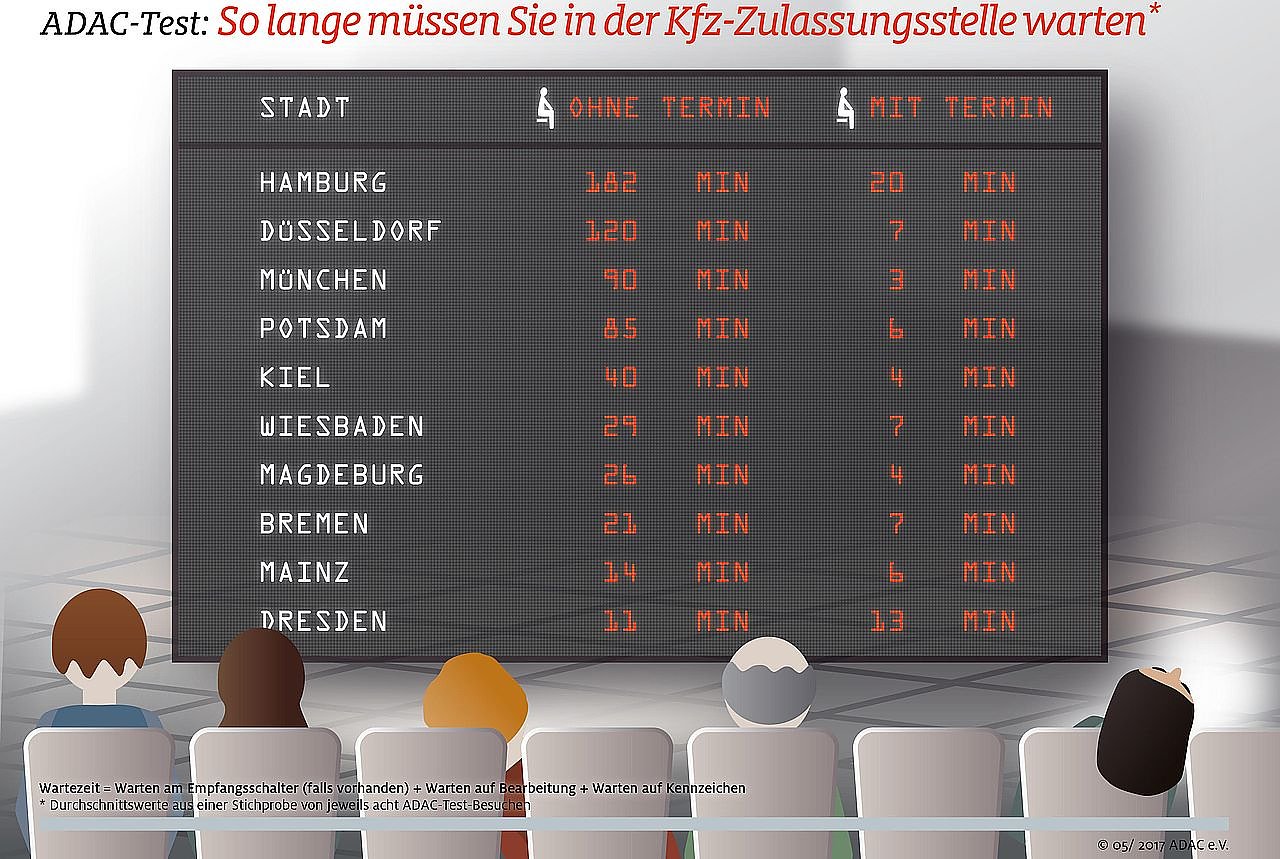 Beste Zulassungsstelle im Vergleich mit der Wertung gut war das Amt in Wiesbaden. Hier dokumentierten die Tester Wartezeiten von durchschnittlich nur sieben Minuten, wenn ein Termin vereinbart war. Auch die Bearbeitungszeit war erfreulich kurz. Anders in der Hamburger Zulassungsstelle: Selbst mit Termin gab es vergleichsweise lange Wartezeiten von durchschnittlich 20 Minuten. Ohne Termin musste man sich im Mittel rund drei Stunden gedulden.
