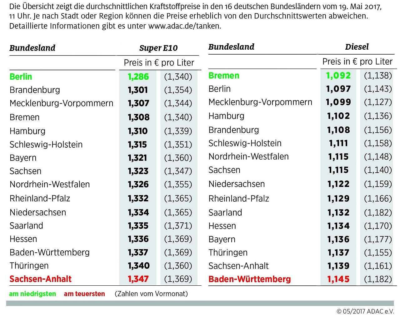 Die Autofahrer in Berlin und Bremen tanken derzeit deutschlandweit am günstigsten. Wie der ADAC mitteilt, kostet Benzin in der Bundeshauptstadt am wenigsten: Dort zahlt man für einen Liter Super E10 im Schnitt 1,286 Euro. Das sind 6,1 Cent weniger als in Sachsen-Anhalt, wo der Durchschnittspreis für einen Liter E10 bei 1,347 liegt...