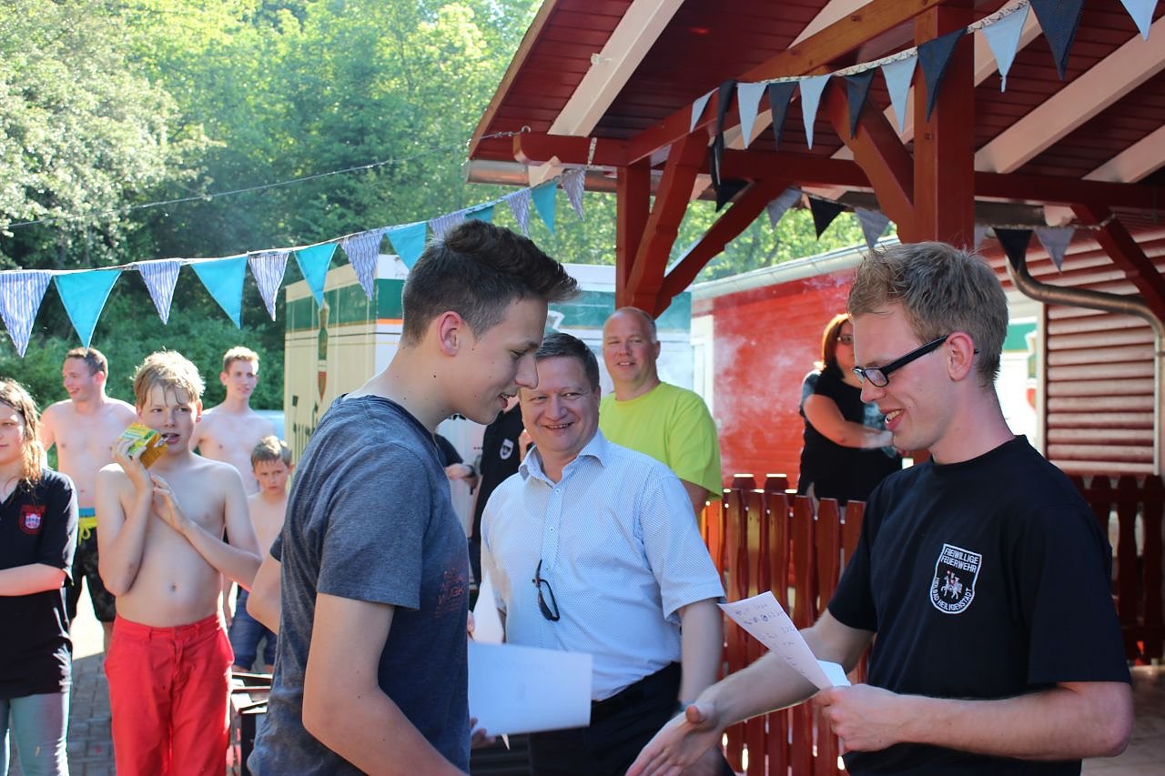 Ziel der dreistündigen Tour war schließlich das Gelände der Feuerwehrbleibe. Hier standen kühle Getränke und frisch Gegrilltes bereit. Ein Pool und eine selbstgefertigte Wasserrutsche über den Hang schufen Abkühlung bei den hochsommerlichen Temperaturen.