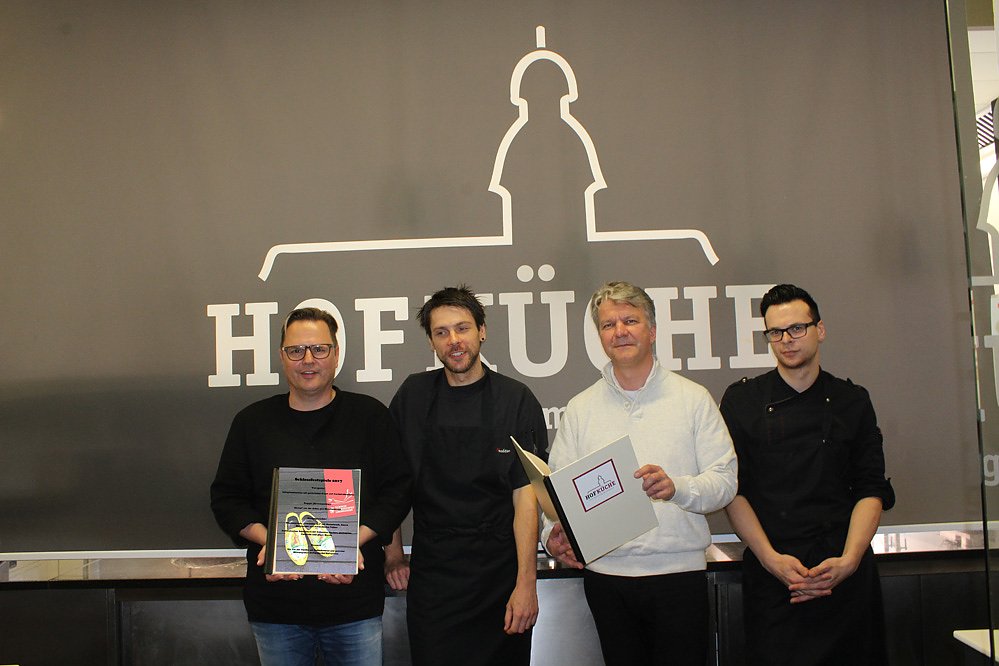 Tobias Schneegans, Norman Köhler (Küchenchef), Intendant Daniel Klajner und Marcus Köhler (Souschef)