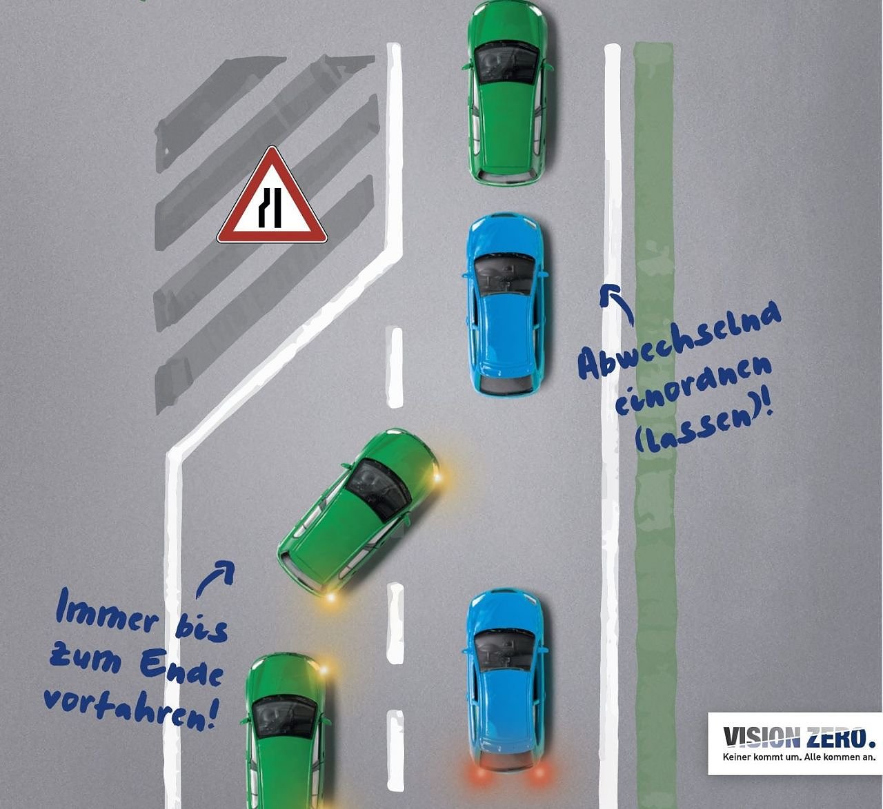 Die richtige Umsetzung des Reißverschlussfahrens ist eines der zehn Plakatmotive der Serie Wie war das noch mal? des DVR und des VDSI – Verband für Sicherheit, Gesundheit und Umweltschutz bei der Arbeit. Die Serie soll zum sicheren Verhalten im Straßenverkehr beitragen und ist eingebettet in die Sicherheitsstrategie Vision Zero. Deren Ziel: Kein Mensch soll im Straßenverkehr oder bei der Arbeit getötet oder so schwer verletzt werden, dass er lebenslange Schäden davonträgt.