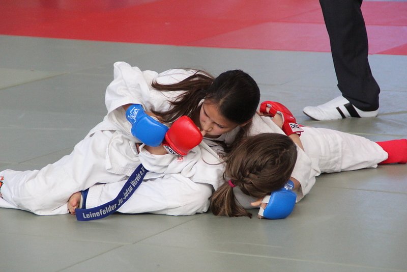 Amimullah (rot,l..) der Jüngste Leinefelder Fighter stellte sich seinem 1. Fightingturnier (Foto: Ju-Jutsu)