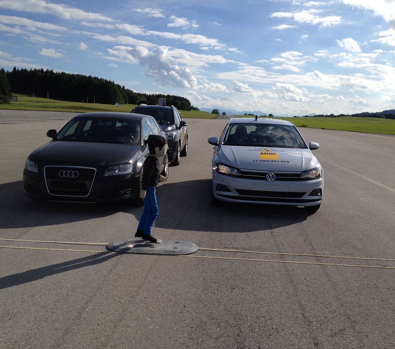 In diesem, vom ADAC mitentwickelten Testverfahren, wird das Bremsverhalten des Fahrzeugs mit 20 bis 60 km/h bei Fußgängerquerungen in vier Szenarien überprüft. Hier erfüllte der Polo fast 90 Prozent der Testanforderungen. In 32 von 36 Testdurchläufen konnte ein Unfall verhindert bzw. ein Aufprall gemildert werden. Ab nächstem Jahr wird auch die Reaktion auf Fahrradfahrer geprüft.